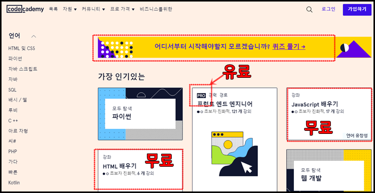 어떤 것부터 시작할 지 모르겠다면, 코드카데미에서 퀴즈 풀기 배너를 눌러서 자신에게 필요한 것이 무엇인지 알아보는 것부터 해보는 것도 좋을 것 같습니다. 아래 첨부한 스크린샷은 한국어 번역 페이지입니다.