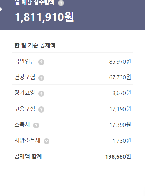 사람인 또는 잡코리아 실수령액 계산기로 본인에게 맞는 정확한 실수령액 알아보세요. 아래는 최저임금으로 계산해본 실수령 월급입니다.