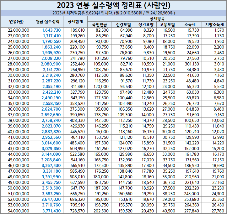 2023년 연봉 실수령액표는 재직중인 기업의 계산법, 미성년 자녀의 수, 비과세 급여 및 추가수당 등 개인의 상황에 따라 차이가 있을 수 있으니 참고용으로만 봐주세요. 자신의 상황에 맞게 실수령 월급 확인하려면 연봉실수령액 계산기를 사용해 보세요.