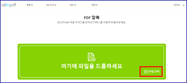 pdf 압축을 선택해서 압축하고 싶은 파일을 선택해서 업로드 해주면 됩니다.