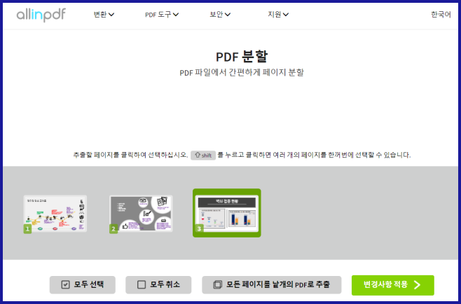pdf 파일에서 하나 또는 몇 개의 페이지만 따로 추출하여 하나의 pdf 파일로 만들고자 할 때 편하게 사용할 수 있습니다. 분할하고자 하는 pdf 파일을 업로드하면 각 페이지 별로 나타나는데요. 여기에서 추출하고 싶은 페이지만 따로 선택해서 '변경사항 적용'을 하면 선택한 pdf 페이지만 따로 추출이 됩니다. 모든 페이지를 낱개의 pdf로 추출할 수도 있습니다.